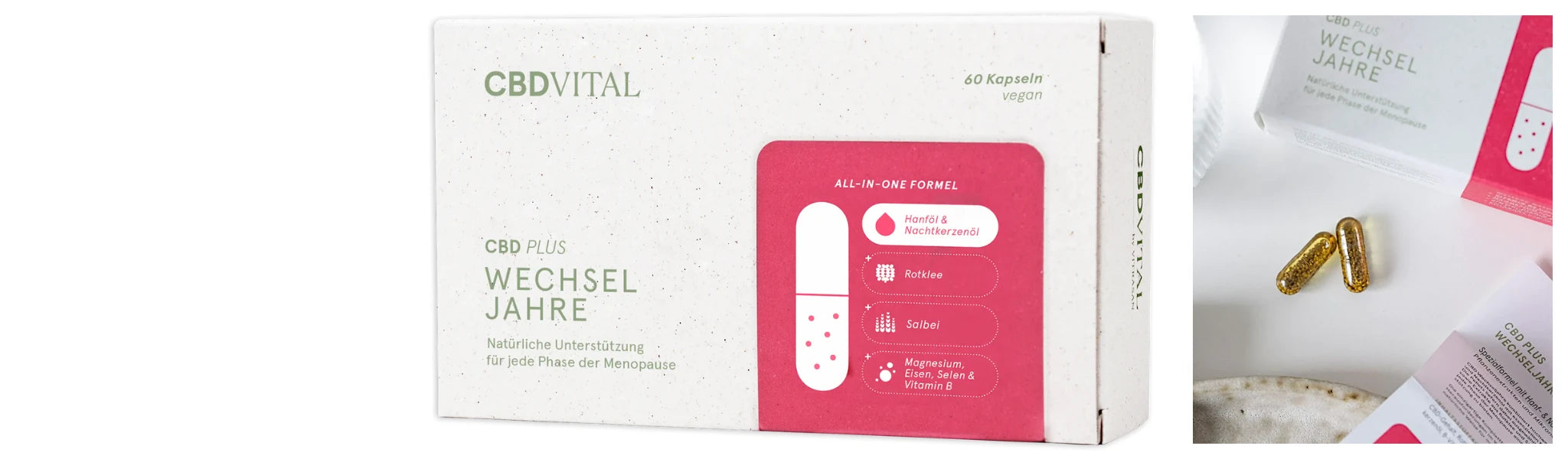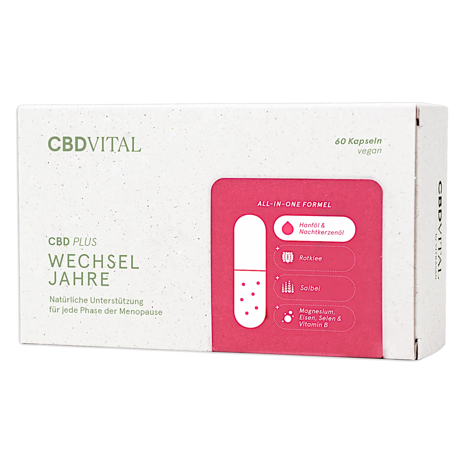 Pflanzliche Formel mit CBD aus Hanföl, Rotklee, Nachtkerzenöl und Salbei – kombiniert mit Magnesium sowie den Vitaminen B6, B12 und Folsäure.